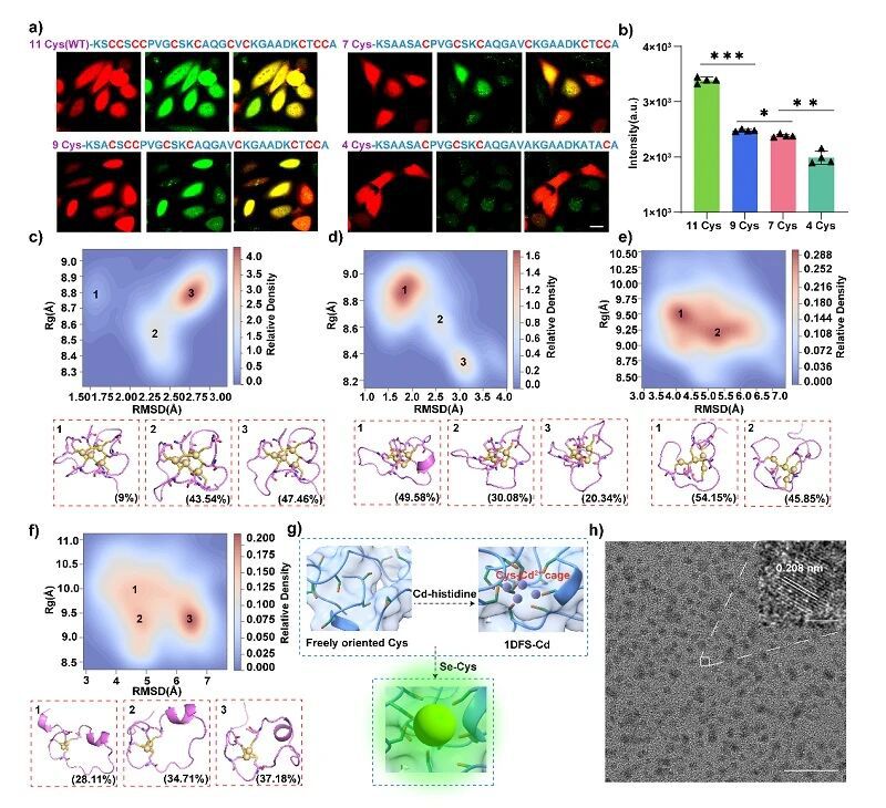 图3. 1DFS 辅助量子点定位合成的机制分析。(a,b) 表达1DFS及其突变体的活细胞中量子点合成的代表性共聚焦成像与流式细胞术分析;(c-f) 1DFS 及其突变体与 Cd2+离子结合的自由能景观分析;(g) 1DFS用于量子点定位合成的机制示意图;(h) 细胞内提取量子点的代表性高分辨透射电子显微镜图像。