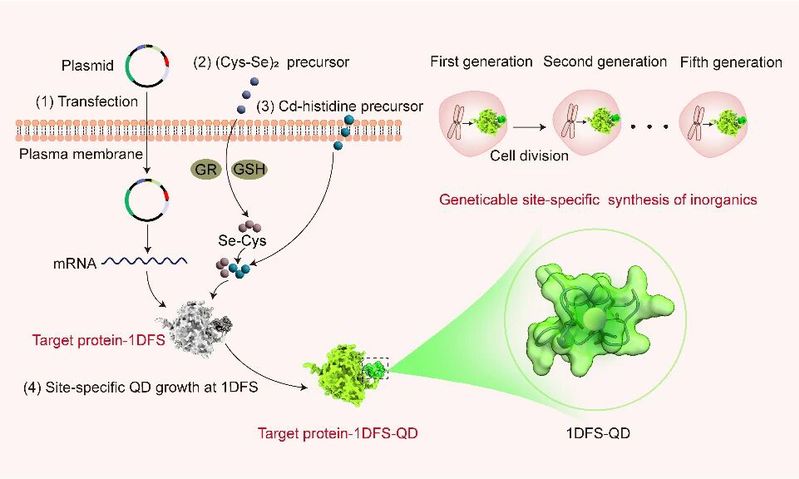 该研究以“在活细胞内实现无机物的分子级精准可遗传合成”为核心突破,设计了一种富含半胱氨酸的31 肽(1DFS),并通过基因编码技术将其融合到目标蛋白质的特定位点(N 端、C端或功能域),作为定点合成的“分子锚点”,特异性捕获细胞内的Cd2+(Cd2+-组氨酸复合物),再以低氧化活性硒代胱氨酸为原料,利用作者开创的“时空耦合”细胞内从不交会的代谢途径在目标蛋白质特定位点原位合成量子点。