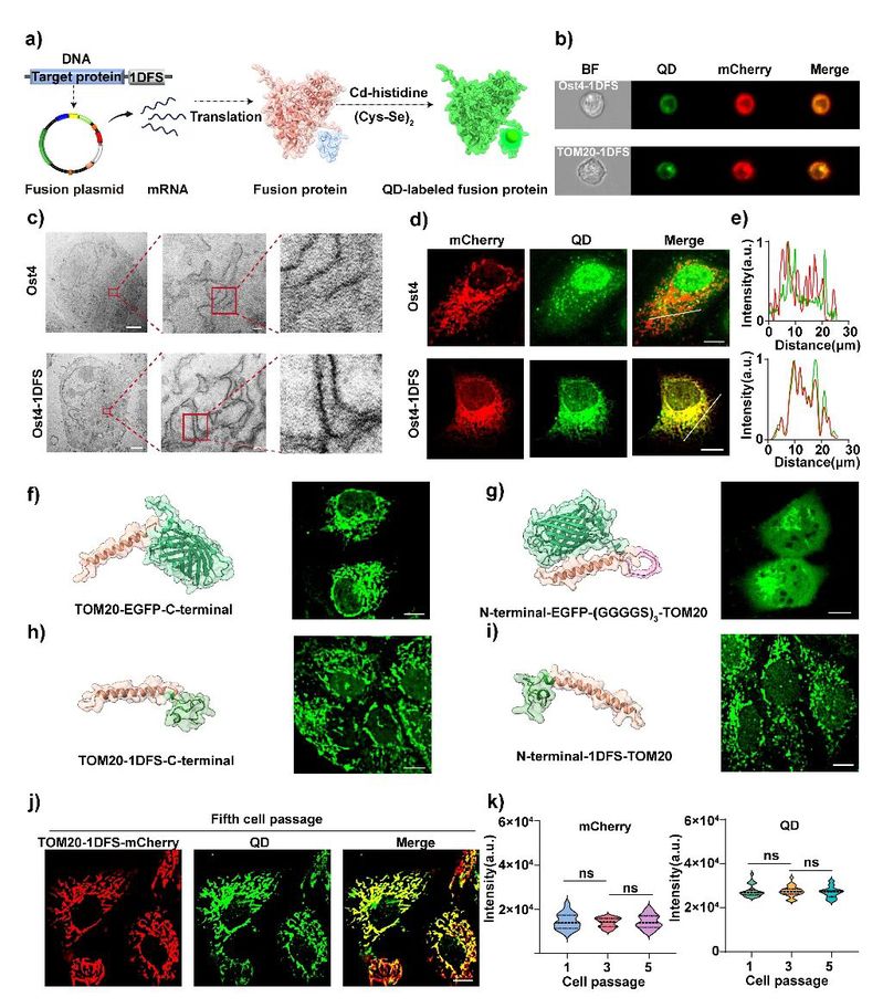 图4. 蛋白标签水平上量子点的空间精准合成。(a) 在特定蛋白质上原位合成量子点的示意图;(b) 表达 TOM20-1DFS-mCherry 或 Ost4-1DFS-mCherry 并原位合成量子点的细胞,其代表性成像流式细胞术图像。TOM20 为线粒体膜蛋白;Ost4 为内质网膜蛋白;mCherry 为红色荧光蛋白;(c-e) 表达 Ost4-mCherry 和 Ost4-1DFS-mCherry 并原位合成量子点的细胞,其透射电子显微镜图像及带共定位分析的代表性共聚焦图像;(f-i) 左图为不同融合蛋白的 AlphaFold3 预测结构;右图为表达对应融合蛋白(增强型绿色荧光蛋白,EGFP标记或原位量子点合成标记)的细胞,其代表性共聚焦图像; (j) 表达 TOM20-1DFS-mCherry 并原位合成量子点的第五代细胞,其代表性共聚焦图像;(k) 在细胞不同传代过程中 mCherry表达的荧光与所原位合成标记的量子点的荧光强度变化。
