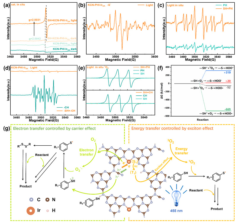 因此作者提出双通道反应机制:可见光照射下,KCN-PHI-IrSA被激发。在电子转移途径中,定位在末端氰基上的光生空穴氧化硫醇底物生成硫醇阳离子(-SH·⁺)。光激发的催化剂被还原猝灭形成KCN-PHI-IrSA·⁻,随后在Ir单原子位点将O₂还原为O₂·⁻。O₂·⁻进而将-S·⁺还原为硫自由基(-S·)。同时,在能量转移途径中,强激子特征促使催化剂经历高效的系间窜跃过程并形成三线态,将能量转移至基态氧气生成¹O₂。¹O₂激活-SH形成-S·。产生的-S·自由基与反应底物交叉偶联,或二聚成中间体,最终生成含S-X键的产物。