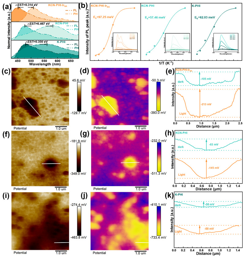 激子与载流子传输动力学是评估光催化机制的关键参数。作者通过稳态和时间分辨磷光光谱分析了光激发体系中的激子过程。对荧光和磷光的峰进行归一化以评估单重态-三重态能隙(ΔEST)。KCN-PHI-IrSA的ΔEST(0.314 eV)显著低于KCN-PHI(0.467 eV)和K-PHI(0.350 eV),证实单原子铱增强了系间窜跃过程。而氮气氛围下磷光强度显著增强,确认该体系高效布居了三线激发态。时间分辨磷光衰减曲线显示KCN-PHI-IrSA的平均磷光寿命最长(17.91 μs)。通过变温稳态荧光光谱(PL)和拟合分析,证明KCN-PHI-IrSA的激子结合能(Eb)为97.25 meV,高于KCN-PHI(57.46 meV)和K-PHI(62.03 meV),证明Ir单原子通过增强库仑相互作用强化了激子限域。