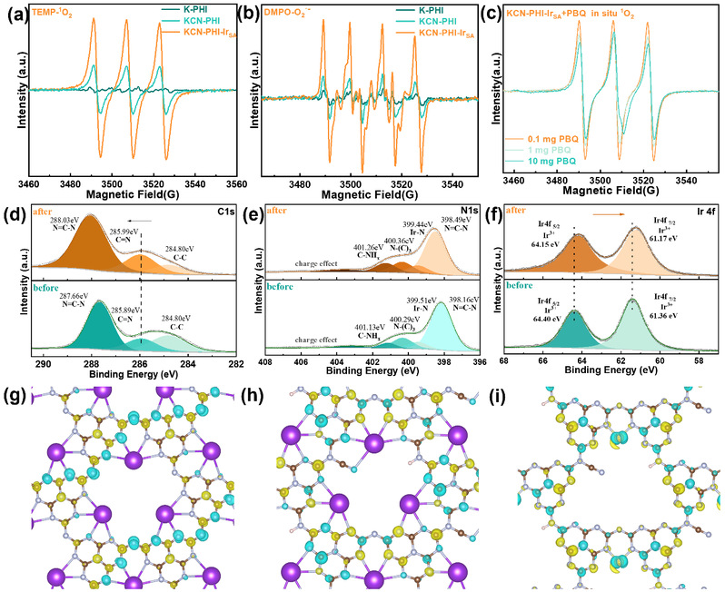 为了评估铱单原子与氰基功能化体系对活性氧生成路径的协同增强作用,作者使用5,5-二甲基-1-吡咯啉N-氧化物(DMPO)和2,2,6,6-四甲基哌啶(TEMP)分别作为超氧自由基和单线态氧的探针进行EPR自旋捕获实验。光照下,KCN-PHI-IrSA产生最强的TEMP-¹O₂加合物信号和DMPO-O₂·⁻信号。对苯醌(p-BQ)猝灭实验证实¹O₂完全由激子介导的能量转移产生,而O₂·⁻由载流子主导的电子转移产生。这些结果表明铱原子和末端氰基在增强激子效应和电荷分离效率方面具有关键作用。随后的准原位XPS揭示,光照时KCN-PHI-IrSA的C=N峰(285.99 eV)向高结合能方向偏移,表明光生空穴向末端氰基转移。同时,铱4f谱向低结合能方向偏移,表明电子在铱单原子位点富集,导致其氧化态低于+3,从而促进电子从铱转移至氧气。DFT电荷密度差图谱支持了这一结论,显示激发态下电子向铱配位环境聚集,有利于O₂吸附和还原。