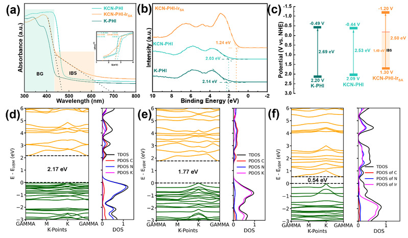 紫外-可见漫反射吸收光谱(DRS)表明,K-PHI的吸收边缘在445 nm。末端氰基的引入使KCN-PHI的吸收边缘红移至486 nm。进一步引入Ir单原子后,KCN-PHI-IrSA在约1.49 eV处出现带内态(IBS*),促进了n→π*跃迁。Tauc图计算得出K-PHI、KCN-PHI和KCN-PHI-IrSA的带隙能量,并通过价带XPS确定其价带的位置。因此得出引入的氰基和单原子的相互作用调节了能带结构,增强的导带电子还原能力使其能够将氧气还原为超氧自由基(-0.35 V)。密度泛函理论(DFT)计算指出,理想K-PHI的带隙约为2.17 eV。末端氰基取代加强了庚嗪单元间的π共轭,带隙缩小至约1.77 eV 。Ir原子与七嗪环中的N配位,Ir 5d轨道与N 2p轨道杂化,产生浅层带隙内态,有效带隙降至约0.54 eV,对应于紫外光谱中观察到的IBS*特征。