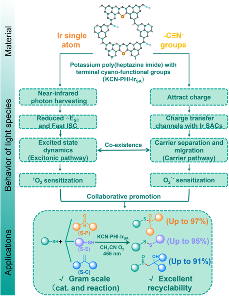本文提出了一种新颖的双功能策略,将铱单原子与末端氰基整合到K-PHI框架中,协同优化激子效应与载流子动力学。通过系统表征与理论分析,发现铱原子通过促进系间窜越来增强激子过程,而氰基则通过建立高效电荷转移通道促进电子分离与传输,并与单原子位点之间生成内建电场——导致电子迁移至铱位点,空穴则富集于末端氰基。两者之间的相互作用能够有效提升光吸收能力。这种双重调控实现了高效的双路径活性氧生成,在无需助催化剂或牺牲剂的绿色条件下,实现需氧氧化偶联构建S-X(X=P、C、S)键。原位电子顺磁共振与密度泛函理论计算共同阐明了S-X键的形成机制,证实单线态氧与超氧自由基均被消耗以生成关键的硫醇自由基中间体,进而驱动反应进行。该催化剂的可规模化合成凸显了其工业应用潜力。本研究为同步优化激子与载流子效应、协同利用双路径机制实现有机转化提供了创新策略。