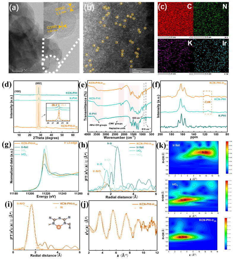 为了进一步验证KCN-PHI-IrSA的表面化学态与配位环境,作者进行了X射线光电子能谱(XPS)的表征。其中C 1s谱表明,引入铱单原子后,N=C-N(288.90 eV)和C=N(286.70 eV)峰发生正向偏移,表明铱位点的存在扰动了电荷分布。N 1s谱中,KCN-PHI-IrSA在399.70 eV处出现一个附加组分,归属于金属-氮(M-N)键。铱4f谱在61.36 eV和64.40 eV处出现双峰,表明Ir处于+3氧化态。随后铱L₃边的X射线吸收近边结构(XANES)和扩展X射线吸收精细结构(EXAFS)分析进一步确认了铱的电子态和配位环境。XANES光谱中,KCN-PHI-IrSA的白线强度介于IrCl₃和Ir箔之间。EXAFS傅里叶变换光谱在1.64 Å处显示主峰,归属于Ir-N配位,不存在Ir-Ir配位,表明Ir原子呈孤立状态。拟合结果揭示Ir-N配位数为2.1,表明Ir单原子与两个氮原子配位。小波变换(WT)分析进一步证实KCN-PHI-IrSA中缺乏Ir-Ir键。