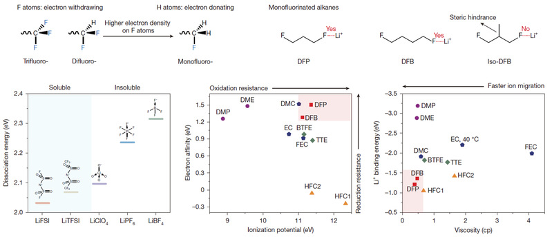 为此,Betway必威团队设计合成了系列新型氟代烃溶剂分子,通过调控氟原子的电子密度和溶剂分子的空间位阻,实现电解液中锂盐的有效溶解,成功取代了传统的锂-氧配位方式。