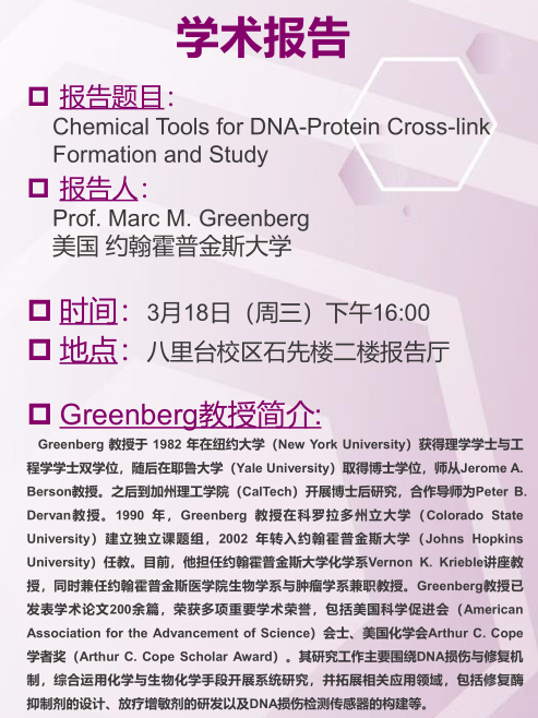 学术报告:Chemical Tools for DNA-Protein Cross-link Formation and Study