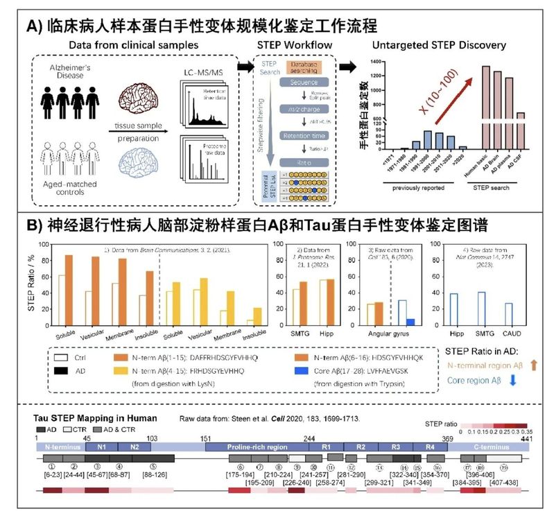 图3、临床样本蛋白手性化学图谱绘制:A) 临床样本蛋白手性变体规模化鉴定工作流程,将手性蛋白异构体的鉴定数量提升1-2个数量级;B) AD病人脑部Aβ42和Tau手性变体含量分布图