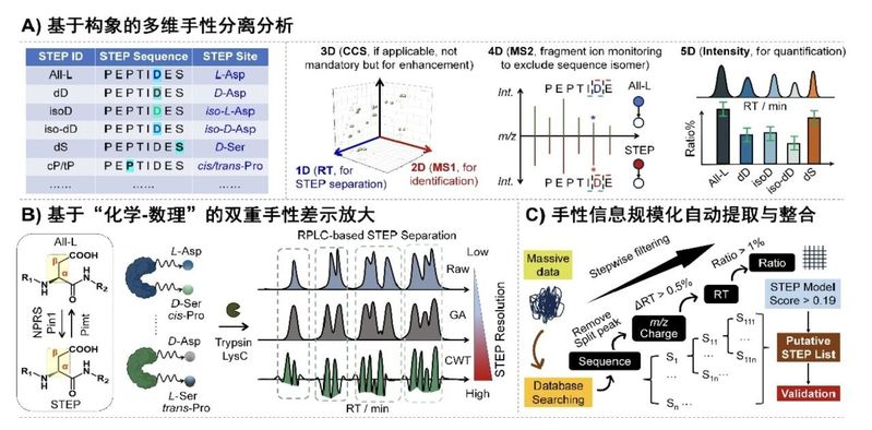 图2、手性分辨蛋白质组学方法体系关键策略:A) 基于构象的多维手性分离分析;B) 基于“化学-数理”的双重手性差示放大;C) 基于机器学习的手性信息规模化自动提取与整合。